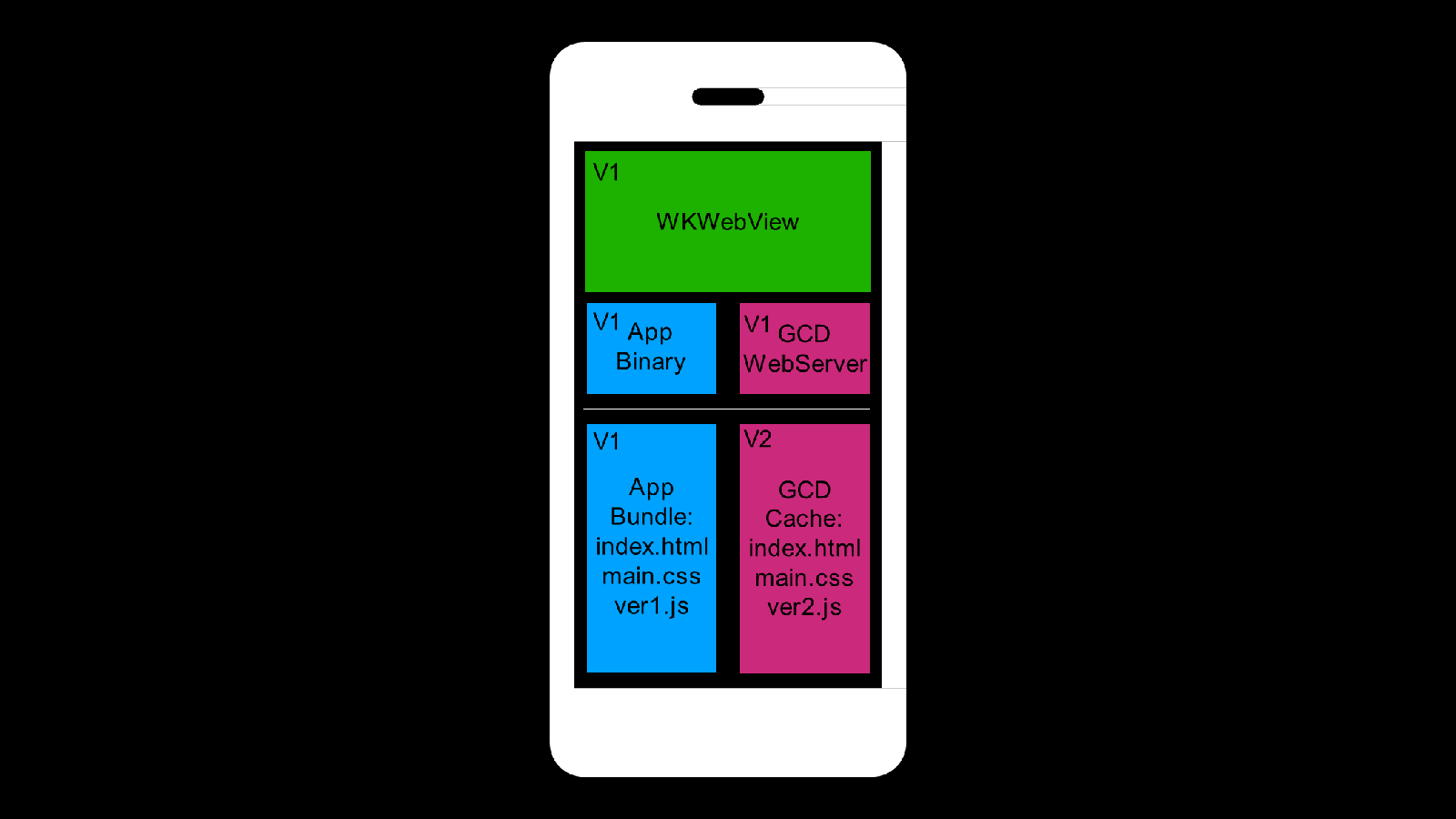 So here’s our partner’s app again, but now we’ve annotated the components with their versions. The tester is running v1 right now, but v2 is available in TestFlight. So we’re gonna go ahead and install v2, but first, notice that the cache content of GCDWebServer is not a part of the app’s .ipa it is distributed with. That’s not something that the developer creates. That cache file gets created when the application runs.
