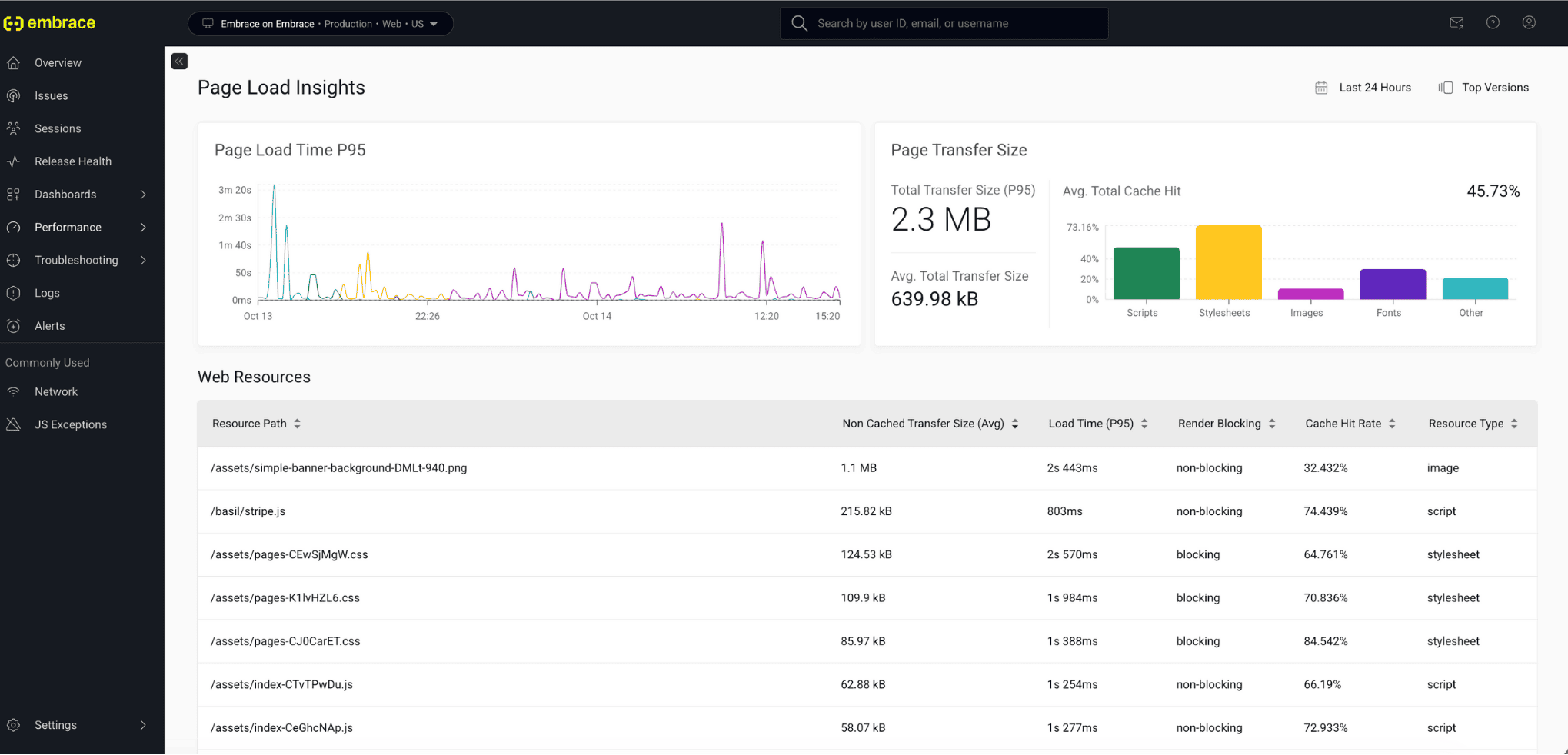 Embrace’s Page Load Insights feature gives you both high-level stats into your website’s overall load performance, as well as detailed breakdown of all the individual page resources that are being fetched. This enables you to get both a quick pulse into your app’s health, as well as conduct deeper analysis into specific elements that might be at the root of rendering or cache issues.