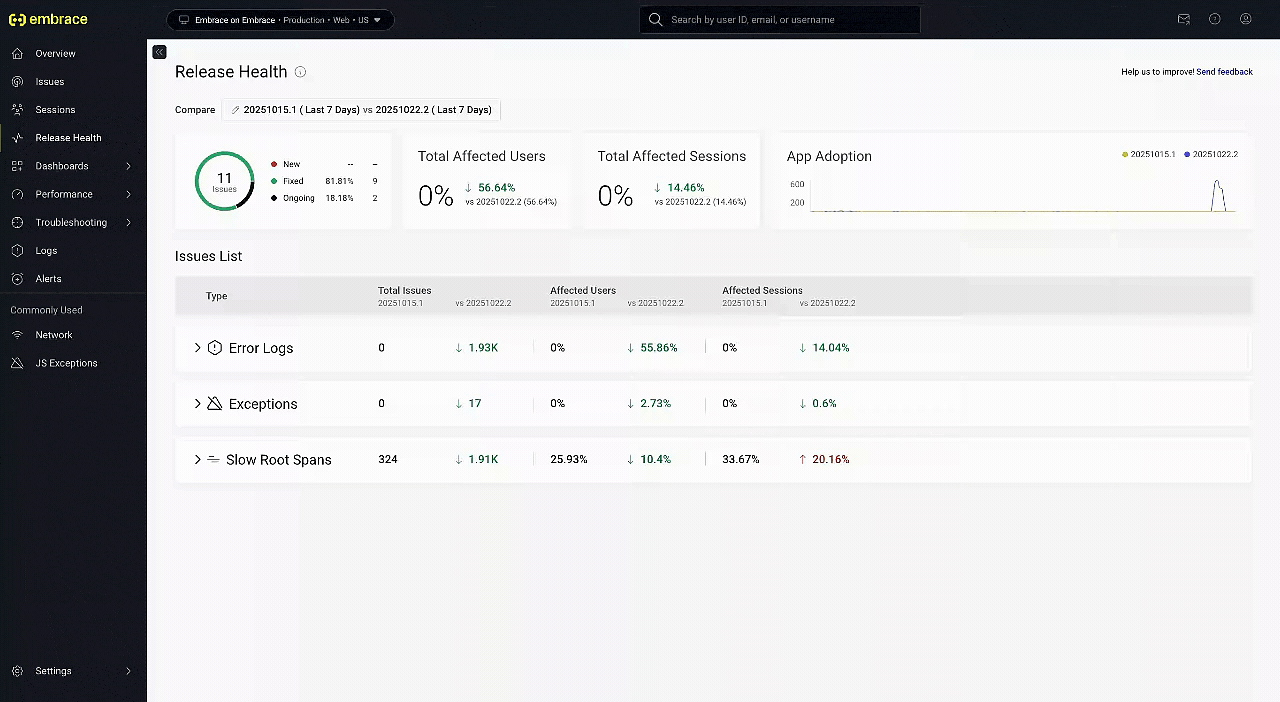 When you ship a new release, you’re balancing two priorities: velocity and stability. You need to know immediately if the latest version is performing better, worse, or exactly as expected. The new Release Health page in Embrace brings that clarity front and center, giving you richer comparisons, expanded data, and actionable insights into every app version you ship.