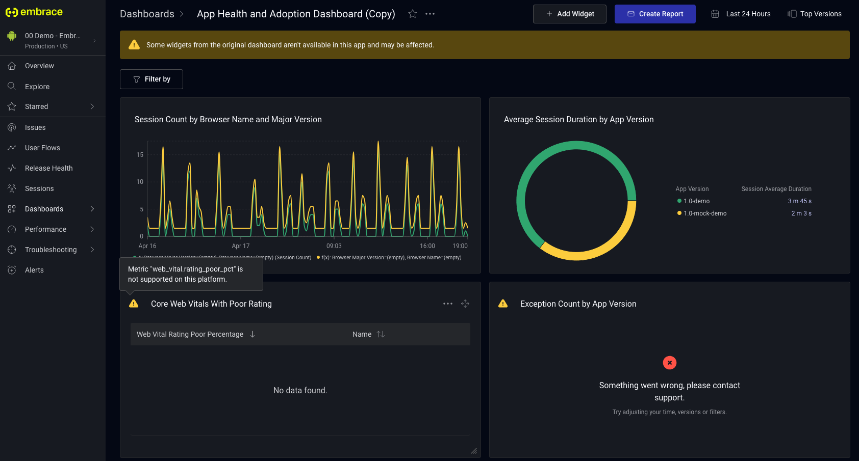 A widget copied across apps may not render correctly if something it depends on, such as a filter key, metric, or dimension, is not available in the destination app. When this happens, the dashboard shows an inline warning, and affected widgets display an error indicator. Hover over the indicator to see a tooltip that explains the specific cause so you can adjust the widget.
