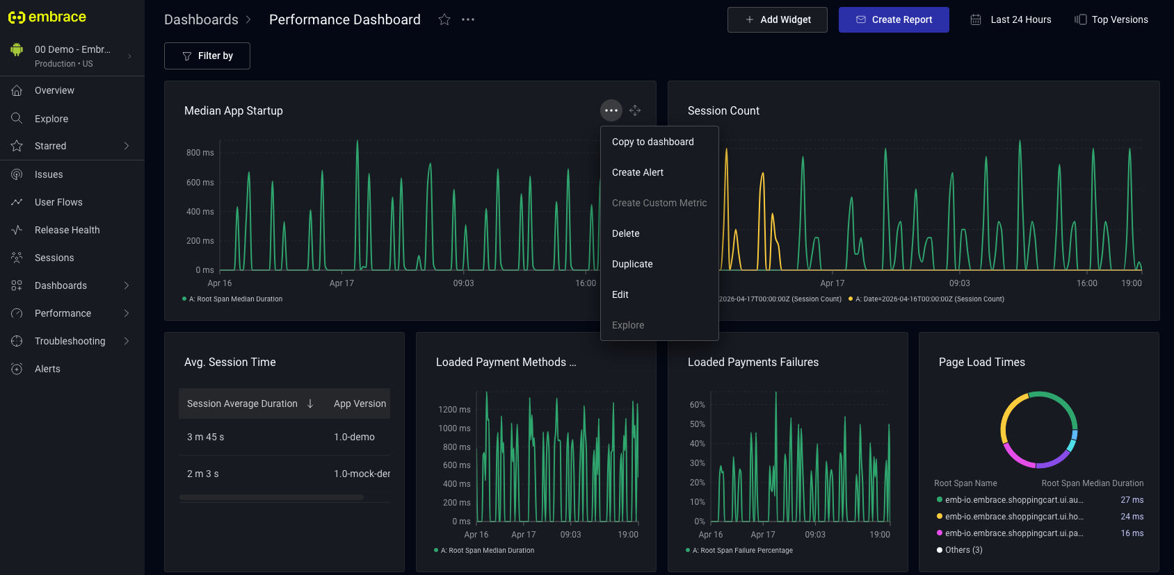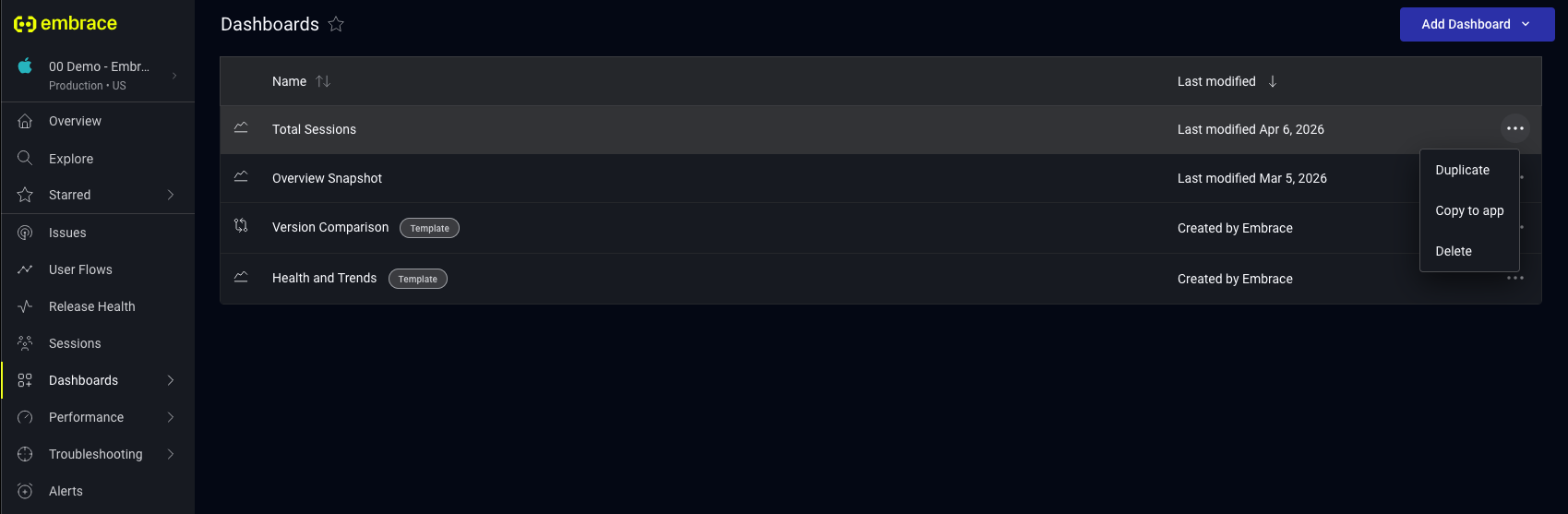 If you manage multiple apps in Embrace, you can copy a dashboard from one app to another instead of rebuilding it. This is useful for teams that want to maintain a consistent monitoring setup across apps.