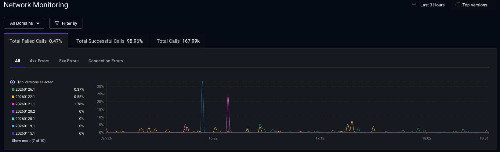 The Network Monitoring dashboard offers a high-level overview of your network requests. You can view the number of requests, and error counts grouped by 4xx/5xx status codes and connection errors. These metrics are also grouped by app version, enabling you to track changes in network performance over time with your releases. Use the filters to analyze network performance based on specific domains, countries, personas, and more.