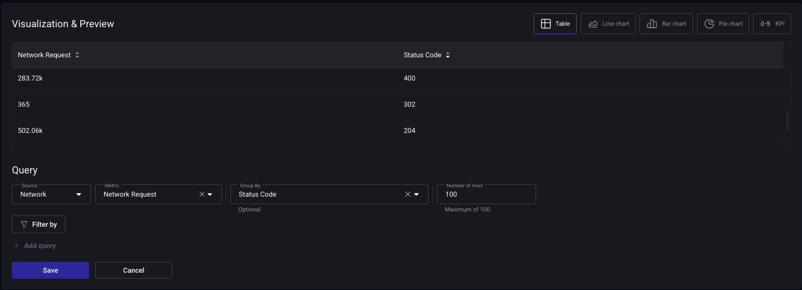 1xx (informational) and 3xx (redirects) responses are excluded from both metrics. To analyze these responses, create a custom dashboard using the Network Request metric grouped by Status Code.