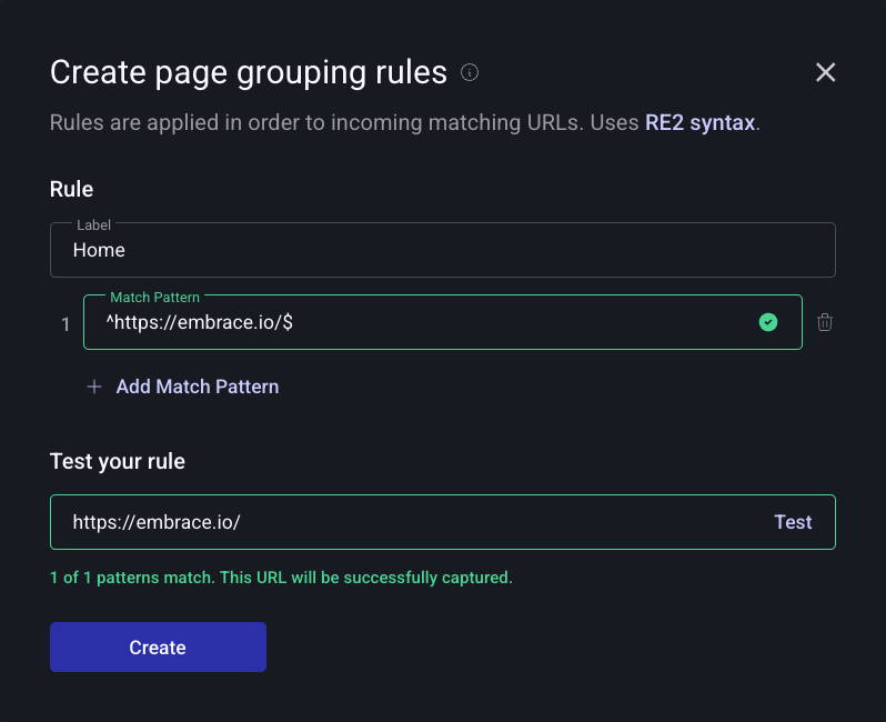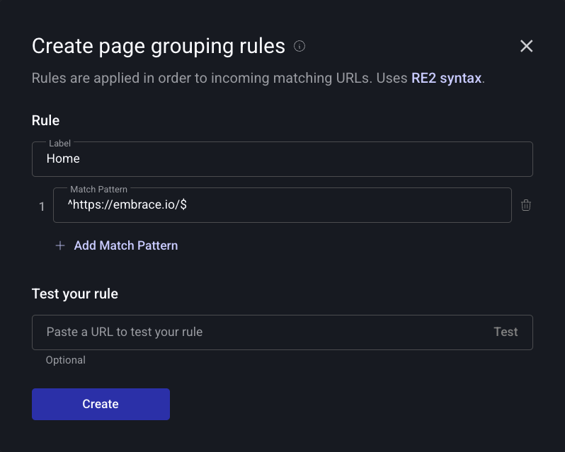 Patterns are defined using RE2 syntax and each page label can have multiple matching patterns.