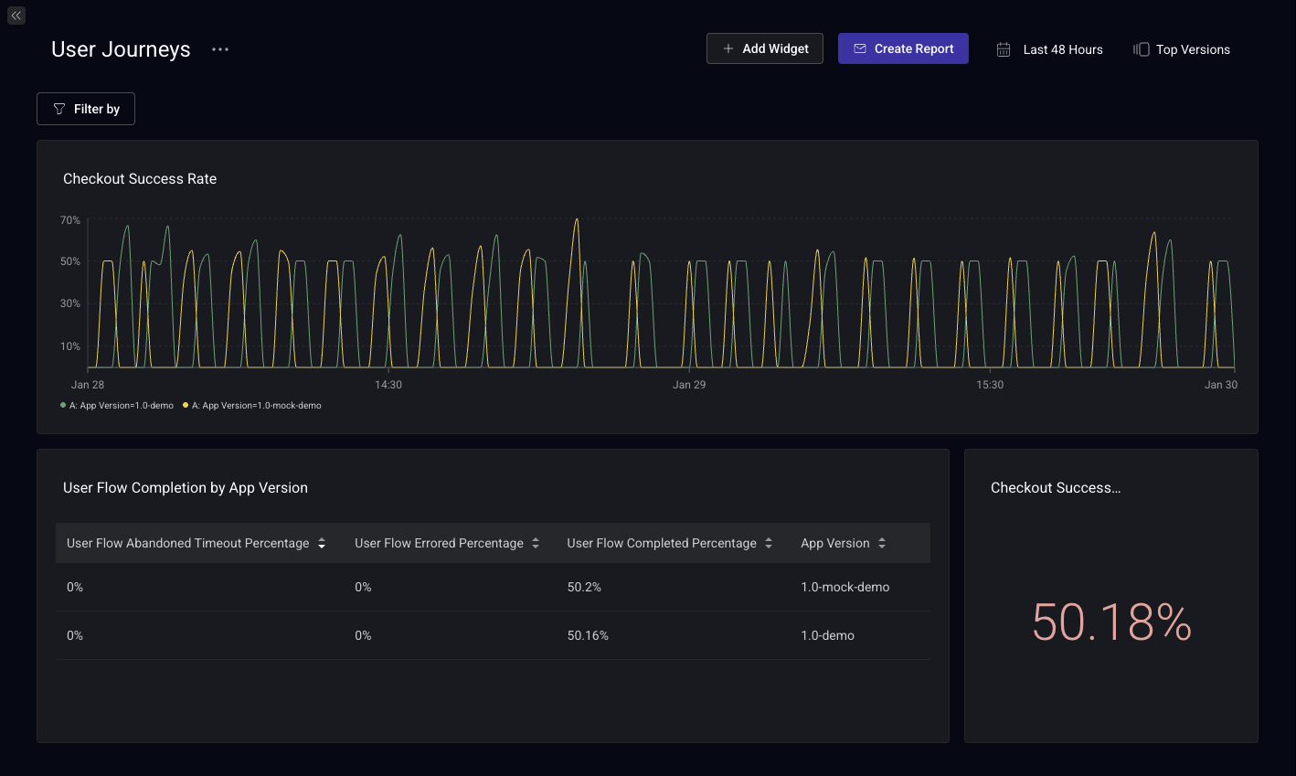 User Flow metrics can be added to Custom Dashboards to monitor key user journeys alongside other performance and stability metrics.